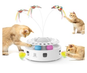 Living in a small space, we need to have multi-purpose toys and this toy is purrfect! It’s interactive and have 3 different options: flying butterfly, in and out feather, and a ball chaser: